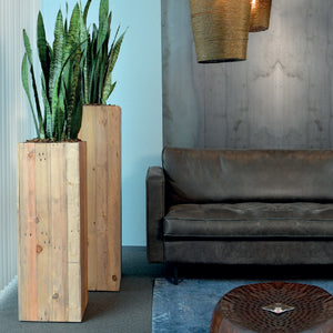 Put sustainable design into practice with these Salvaged Wood Planters. Each planter is made from pine that is salvaged from used pallets and shipping crates. The wood is carefully cleaned, planed and sanded giving a stunning look of natural weathered pine. These hand crafted planters are strong and highly functional. They are coated in a light, water-based finish. Choose from these popular shapes for your Salvaged Wood Planters: Cube, Tall Square, Floor Rectangle, and File Top Rectangle. These planters are designed to hold one or more liners made from recycled plastic. The liners keep the planters water tight. Salvaged Wood Planters are for indoor use only.